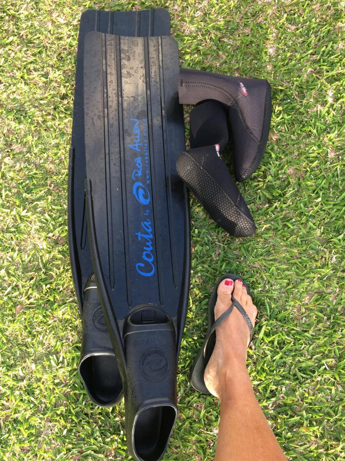 Vends 2 paires de Palmes longues à voilures détachables de marque "COUTA by ROB ALLEN" taille 40-41 état neuf, avec chaussons en Néoprène (neufs) : 15.000 xpf /paire avec chaussons et 12.000 sans chaussons.