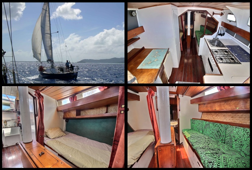 A VENDRE Voilier Midge 50 Longueur : 9m80 Largeur : 3m20 Année : 1979 Coque ferrociment Moteur inbord Yanmar 3YN20, 20CV de 2008 Nombre d’heures : 450 heures Aménagement intérieur : Table à carte et cabinet de toilettes 1 cabine double en pointe avant 1 grand salon avec couchette 1 grande cuisine avec gazinière 4 feux + four, plan de travail et frigo 30 litres 1 couchette cercueil transformée en rangement Equipements : Jeux de voiles complets : triquette baumée, Yankee, Génois endraillé et grande voile 3 panneaux solaires 80W 1 VHF Transformateur 12V => 220V 600W Annexe semi-rigide de 3m80 avec moteur Yamaha 4CV Prix : 1 300 000 xpf Tel : 87.28.85.89 (Sylvie) Localisation : Punaauia Marina Taina